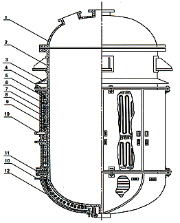 1、 釜壳 2、 釜体 3、 防水罩 4、 固定法兰 5、 碳化硅板 6、 电阻带 7、 保温层 8、 辐射屏蔽层 9、 加热器壳体 10、接线电极 11、固定釜加热器壳体环 12、加热器底壳 |
